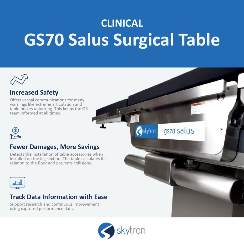To learn more about our tables available visit here and meet the Guardian Series, the next generation of surgical tables from Skytron. The GS70 Salus was designed with staff and patient security in mind. Named after Salus, the Roman goddess of safety and well-being, the GS70 operates under that pretense with its unique features by keeping the OR Team informed and safe before, during, and after surgery.